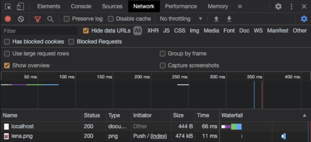 main.goを実行し、Chrome でhttps://localhost:18443/にアクセスした際にデベロッパーツールで通信内容を確認しました。また、サーバプッシュを無効にしてサーバを起動したい場合は以下のコマンドで実行できます。