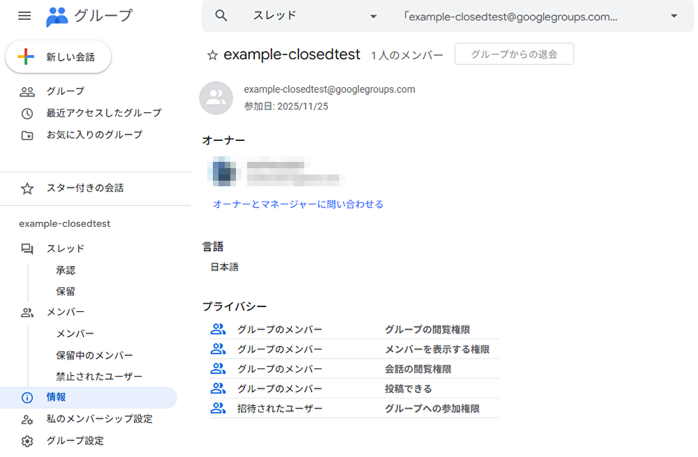 情報にてGoogleグループのメールアドレスを取得します。(下画像の場合は「example-closedtest@googlegroups.com」)