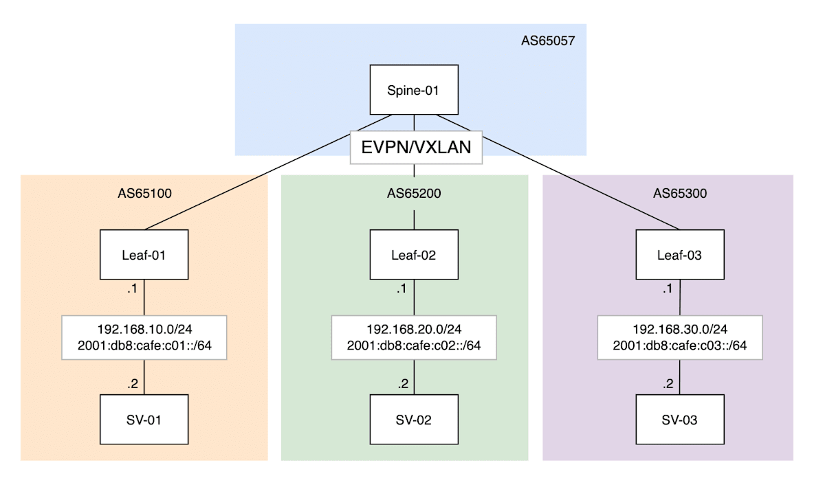 - Leaf/Spine 間は IPv6 LLA(Link-Local Address) を用いて EVPN/VXLAN を構成しています。