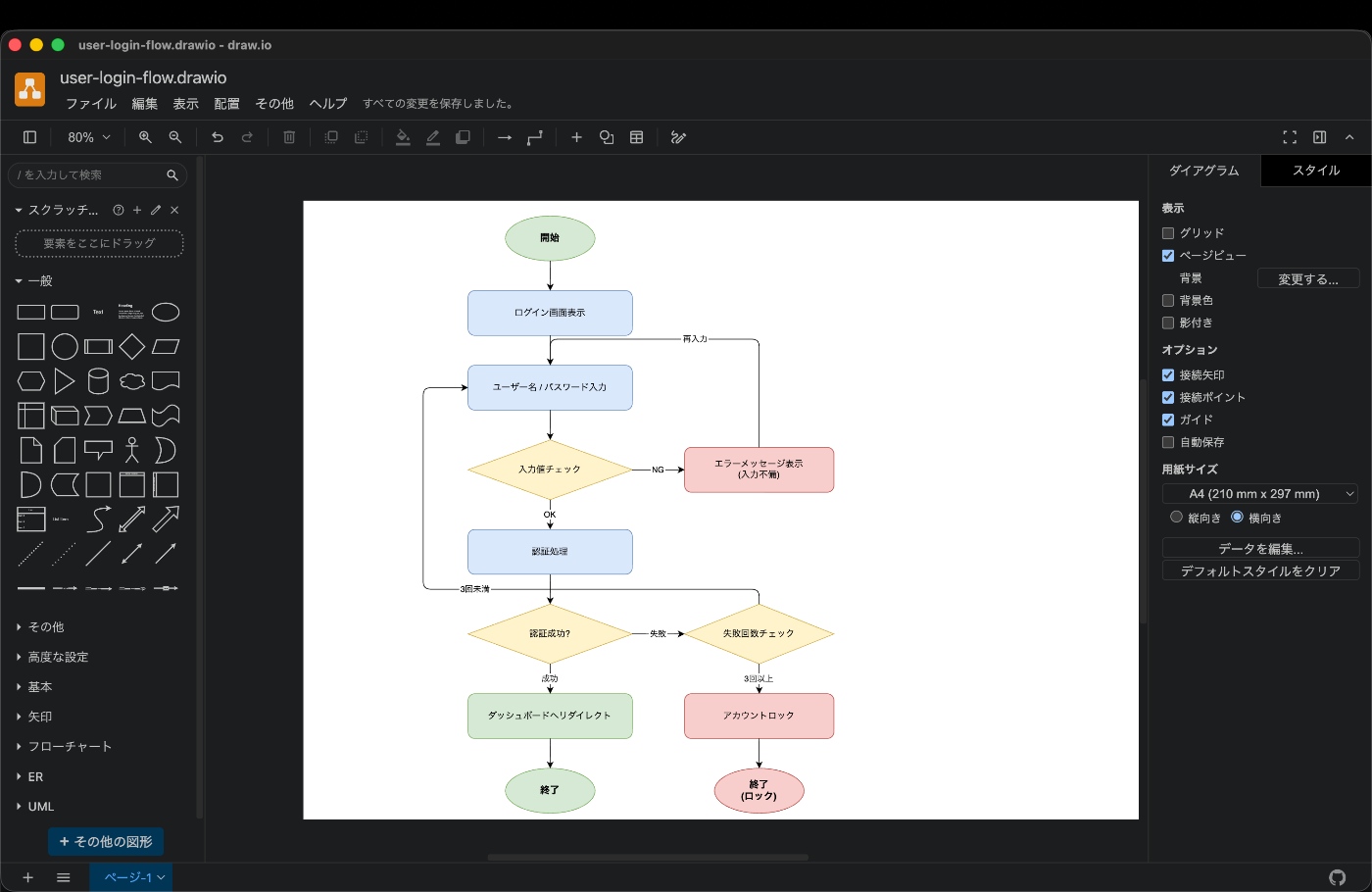 open_drawio_xml を使って、ユーザーログインのフローチャートを作成して