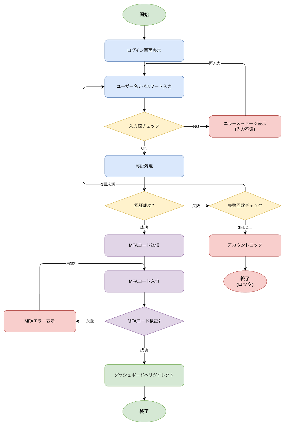 + <mxCell id="29" parent="1" style="rhombus;whiteSpace=wrap;html=1;fillColor=#e1d5e7;strokeColor=#9673a6;" value="MFAコード検証?" vertex="1">