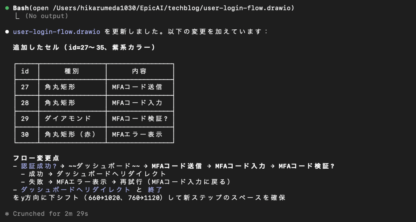 既存のノードやエッジはそのままに、MFA 関連のセルだけが追加されました。git diff で確認すると、追加されたセルのみが差分として表示されます。
