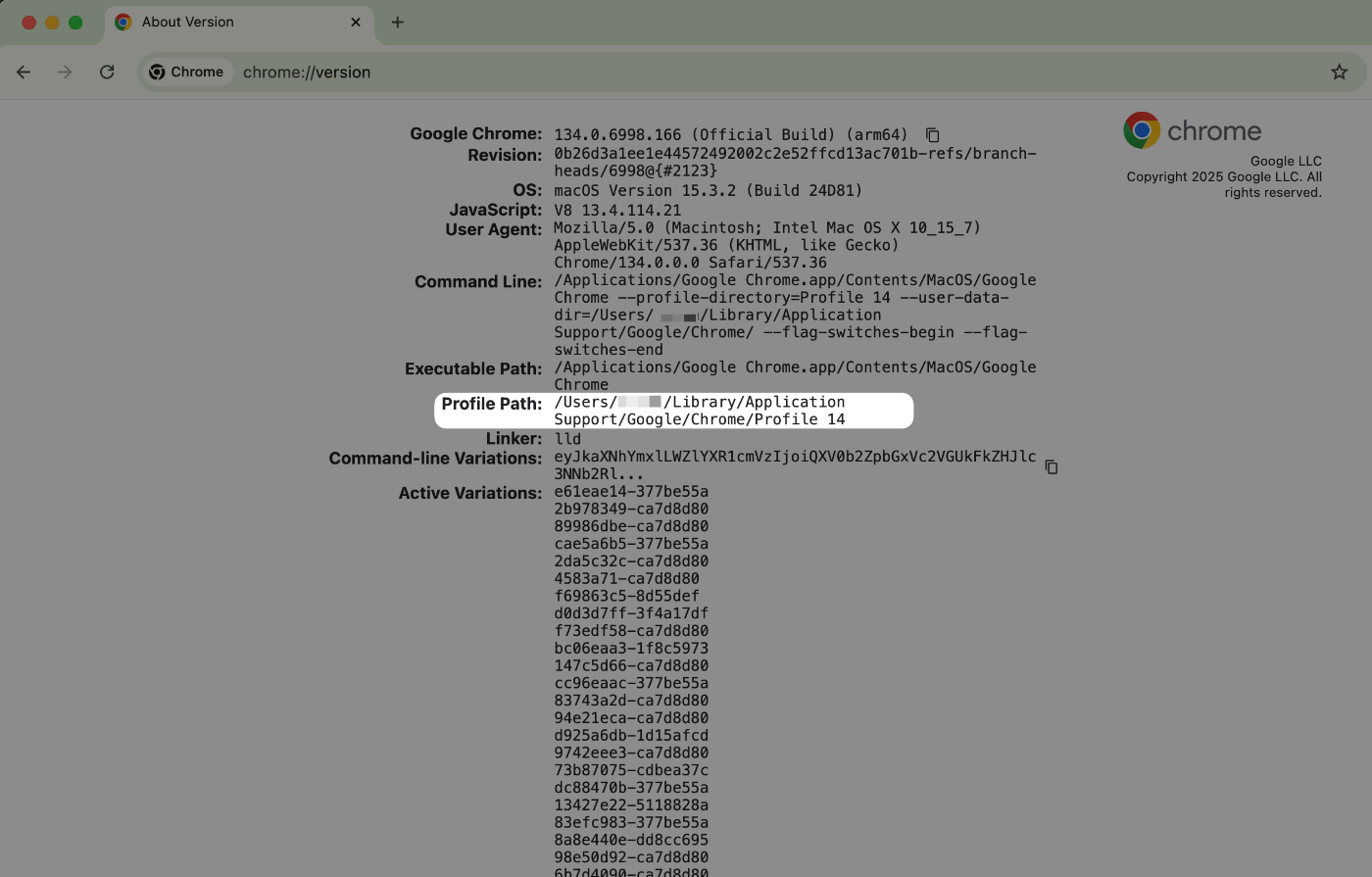 まず指定したいChromeプロファイルでchrome://version/にアクセスして、ハイライトの部分Profile Pathに今のChromeプロファイルのコードネーム(ここはprofile 14)が記載。これがフォルダ名である。