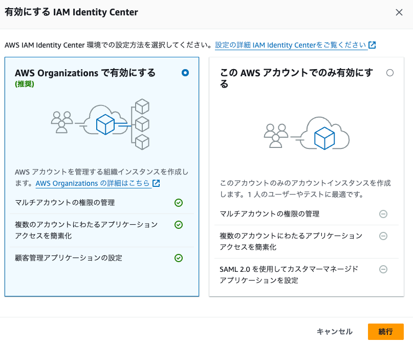 個人利用なので、このAWSアカウントでのみ有効にするにしようとしたのですが後続のアカウントへのアクセス権限を付与するところで詰んだのでOrgnaizationsにします。。。