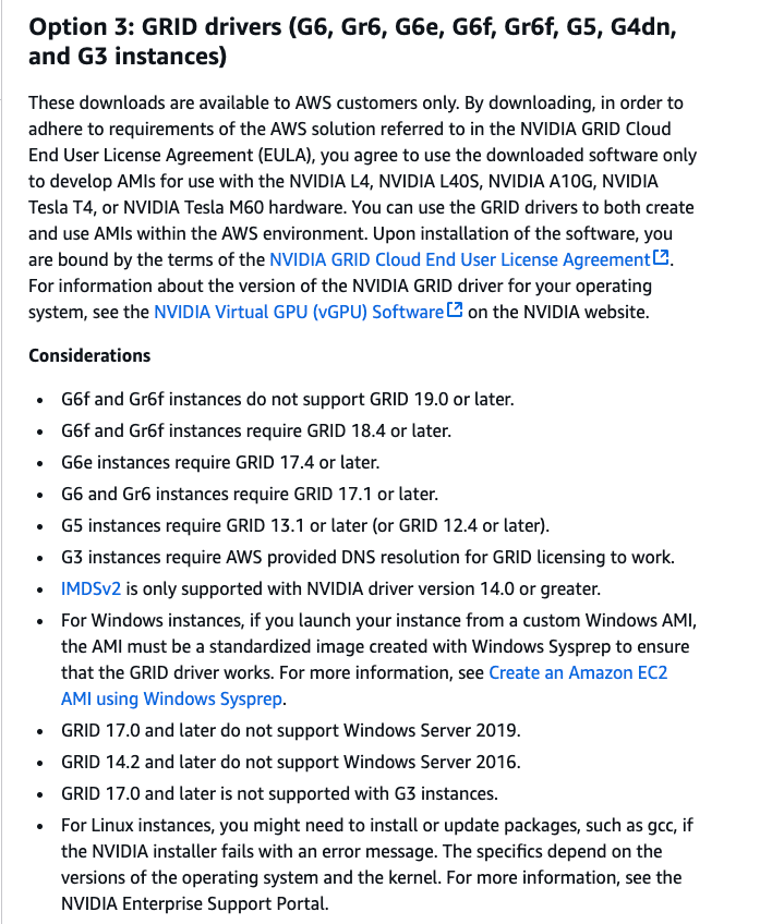 上記のような結果になります。あまりにも長すぎるので一部省略しました。今回使用可能なのは、grid-18.4/NVIDIA-Linux-x86_64-570.172.08-grid-aws.run