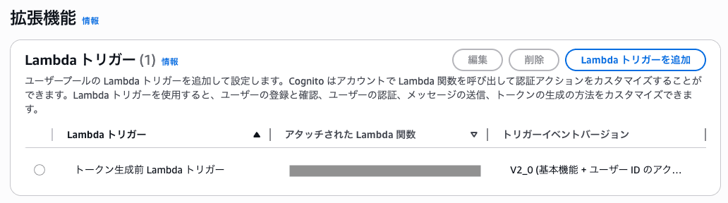 マネジメントコンソール上では、 Cognito のユーザープールの「拡張機能」から設定できます。