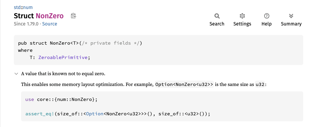 検証をする対象として、簡単な NonZero<u8> 型を使用します。これはメモリ最適化などをコンパイラが自動で行うときに使用されることがある型です。非零が保証されているので、例えば Option<u8> に比べて Option<NonZero<u8>> とすることで、 None を 0 と表現することができ1バイトのメモリ節約をすることができます。コンパイラが自動で行う最適化部分でのunsafe検証は極めて重要です。