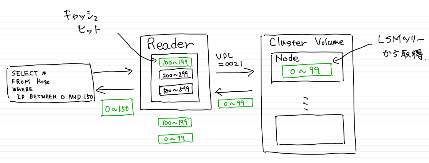 ここで、クラスタボリュームとのコミットのためのやり取りは同期式のコネクション型(返事を待つ)であるのに対して、Readerとのページキャッシュ更新はコネクションレス型(完了を待たない)であることに注意が必要。コミットの確定はあくまでクラスタボリュームとの合意を持って行われるので、そこからredoログをReaderへ送信してページキャッシュの更新の完了までは待機しない。よって、WriterへのリクエストとReaderへのリクエストでレスポンスが異なる状態が発生しうる。その遅延は20〜40msらしい。