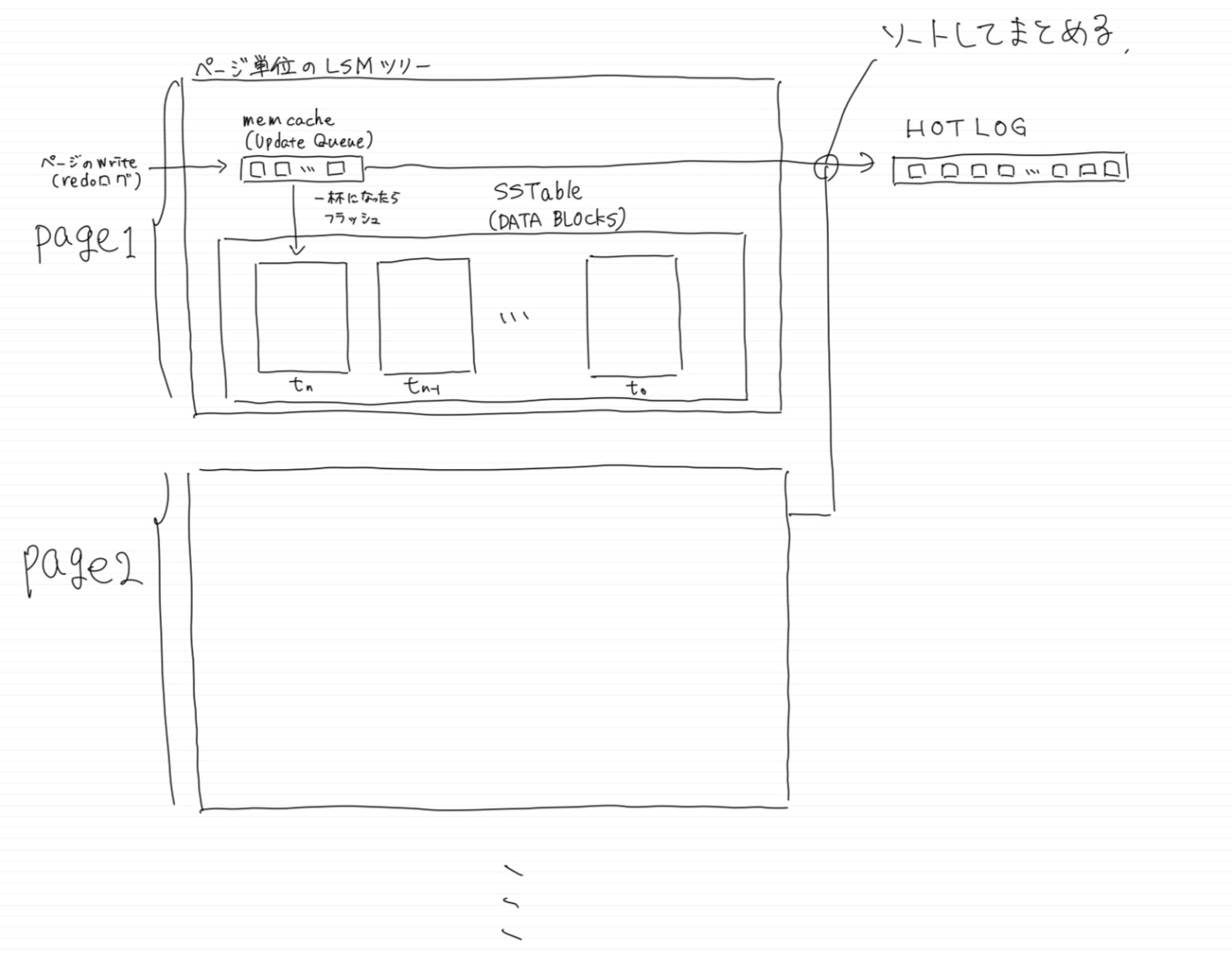 UpdateQueueとDATA BLOCKSがページ単位でストレージノードに存在し、UpdateQueueがいっぱいになったら新しいバージョンをDATA BLOCKSにフラッシュしていそう。
