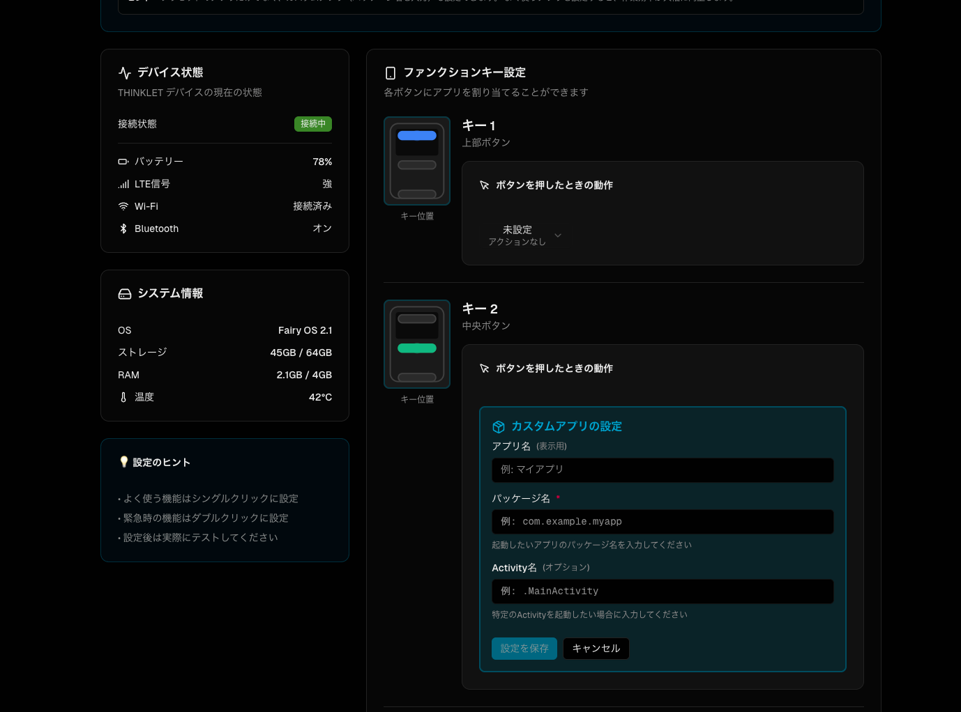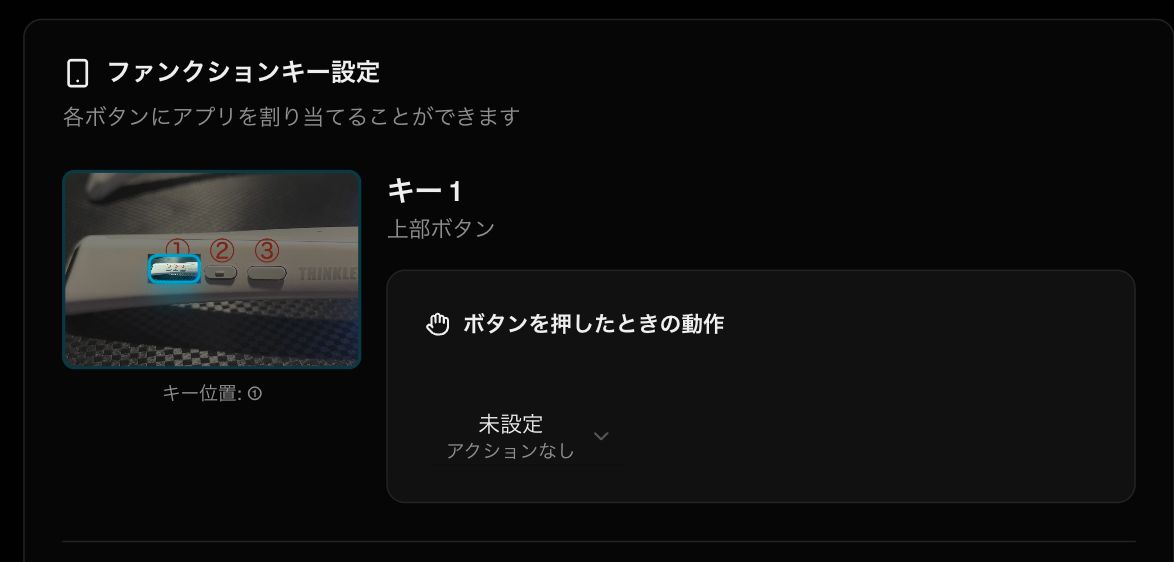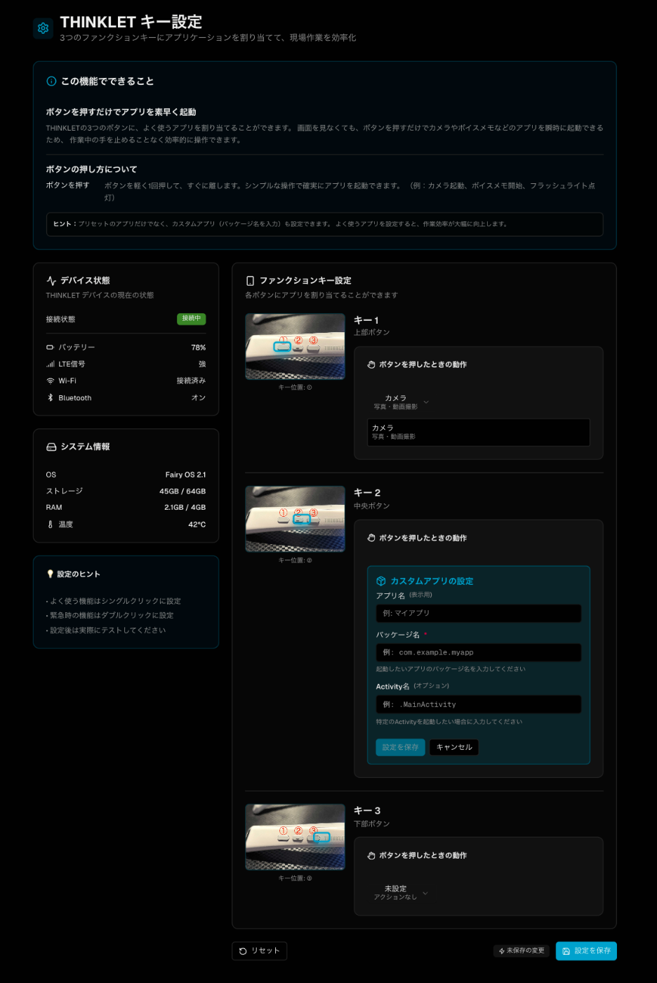 THINKLET には 3 つのボタンがあり、このボタンアクションは開発者側で自由に変更できます。ボタンアクションの変更方法は THINKLET開発者ポータルの キーコンフィグページに記載されています。ただ、私のような非エンジニアからすると少々ハードルが高いと考え、この設定を GUI で行える「キー設定アプリ」のプロトタイプを作成することにしました。