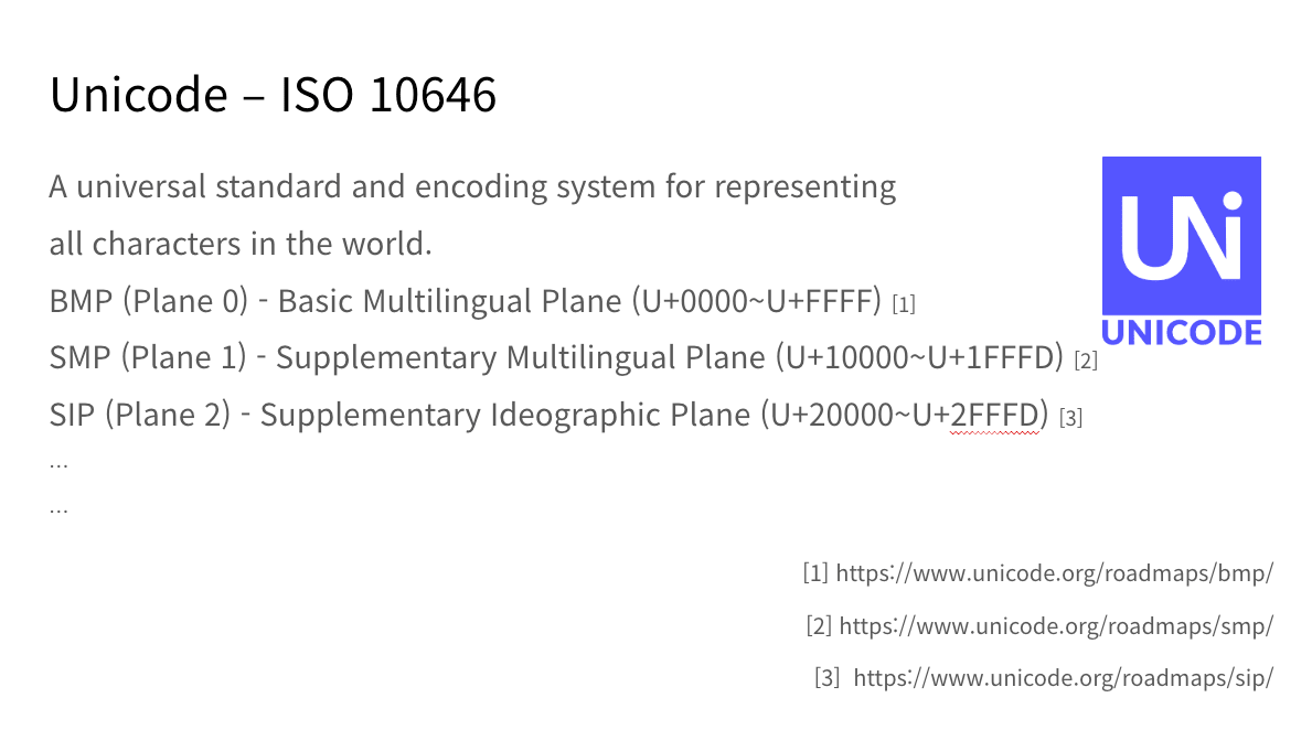 まず、Unicodeについて見ていきましょう。UnicodeはISO 10646という規格です。言い換えれば、Unicodeとは世界中のすべての文字を表現するための一貫した規格であり、同時にこれらの文字を管理する機関でもあります。このUnicodeには、いくつかの大きなブロックに分かれています。