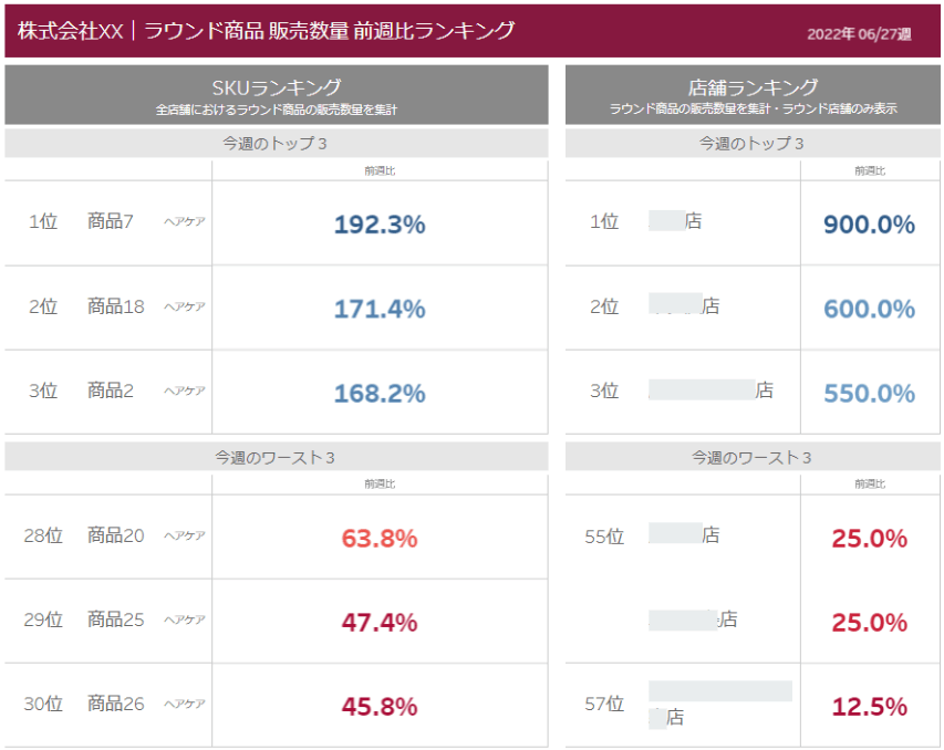 店頭開発アナリストに「クライアントに定期メールで毎週ラウンド商品の販売数量ランキングを出してあげたいな~SKU別と店舗別でわかりやすい感じでできたら喜んでもらえるかな~」というご相談をしたところ、快くつくってくださいました。神。