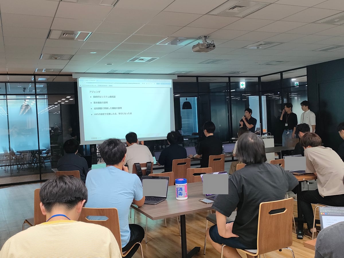 開発したシステムがどのように機能するのか、追加実装では何をしたのか、工夫したこと、学んだことなどを話してもらいました。