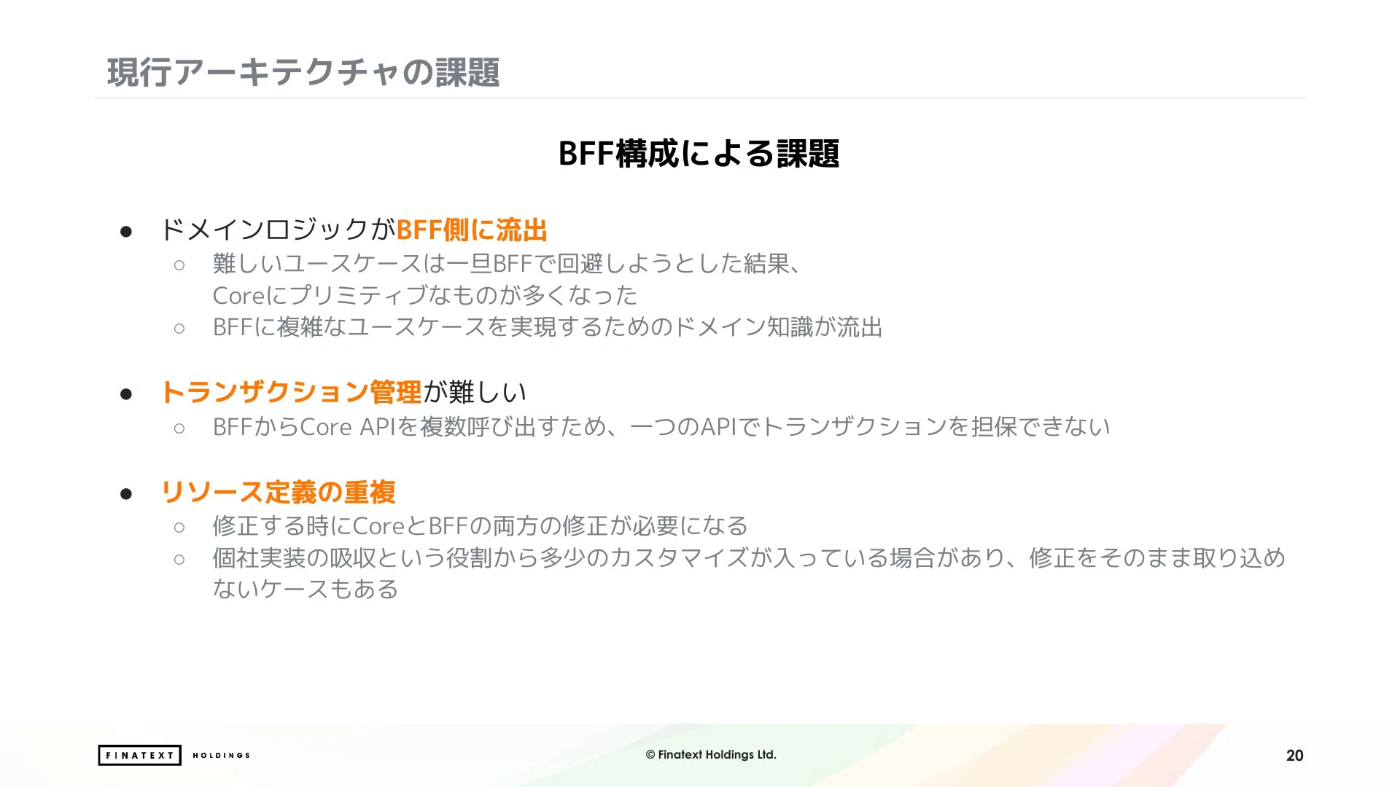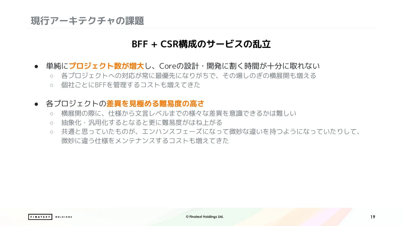 そして、各テナント毎にBFF(Backend For Frontend)を用意して、個社固有の実装や、共通化すべきかその時点では不明瞭な要件などをこのレイヤーで吸収するようにしました。