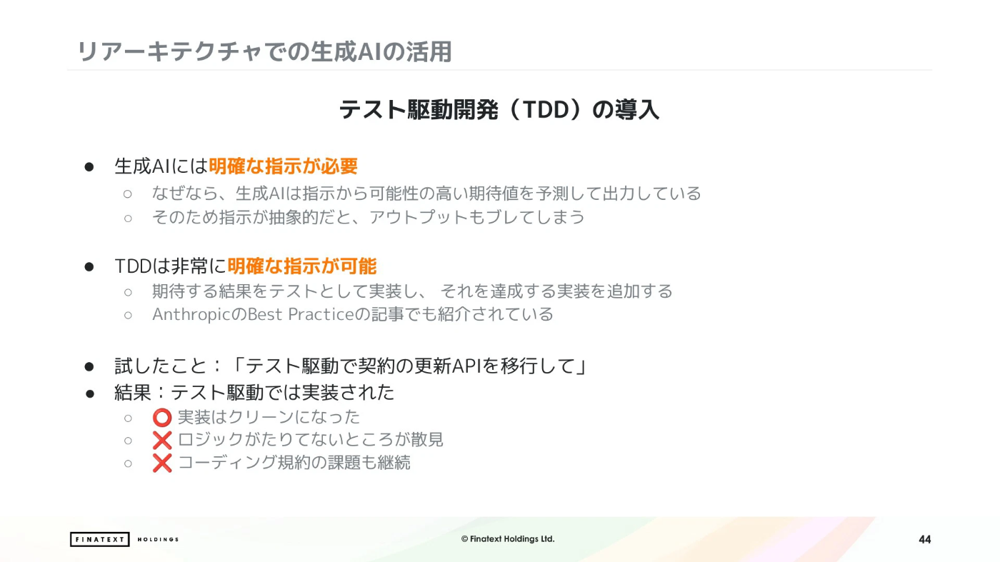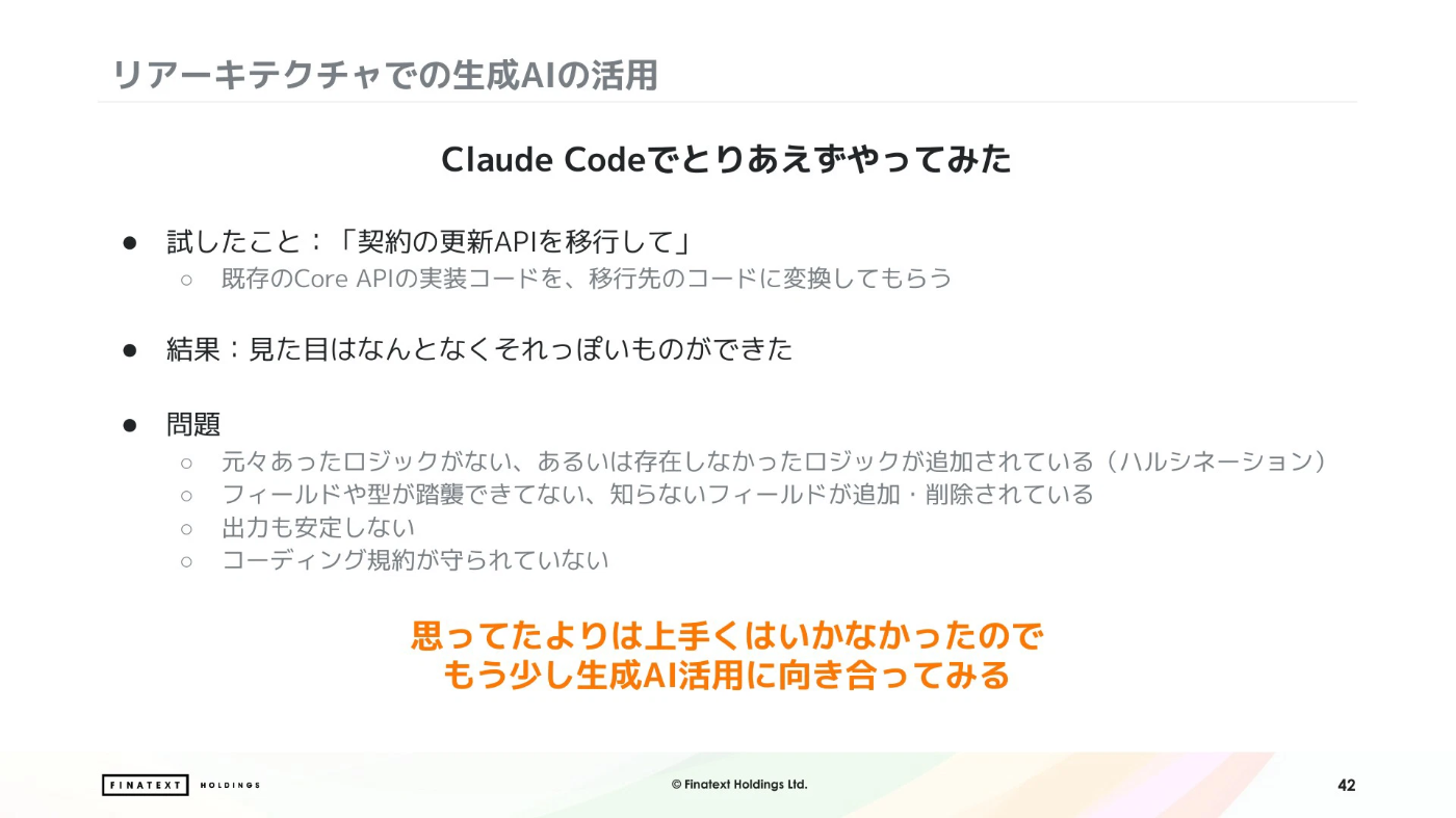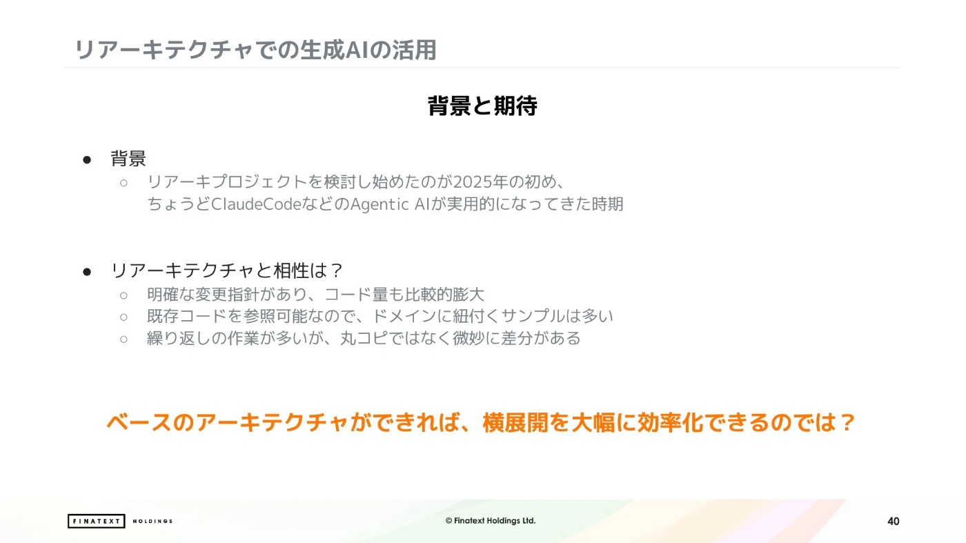 ちょうどリアーキテクチャのプロジェクトが始まったのが2025年の始めごろだったのですが、Claude CodeなどのAgentic AIが実用的になってきた時期でした。