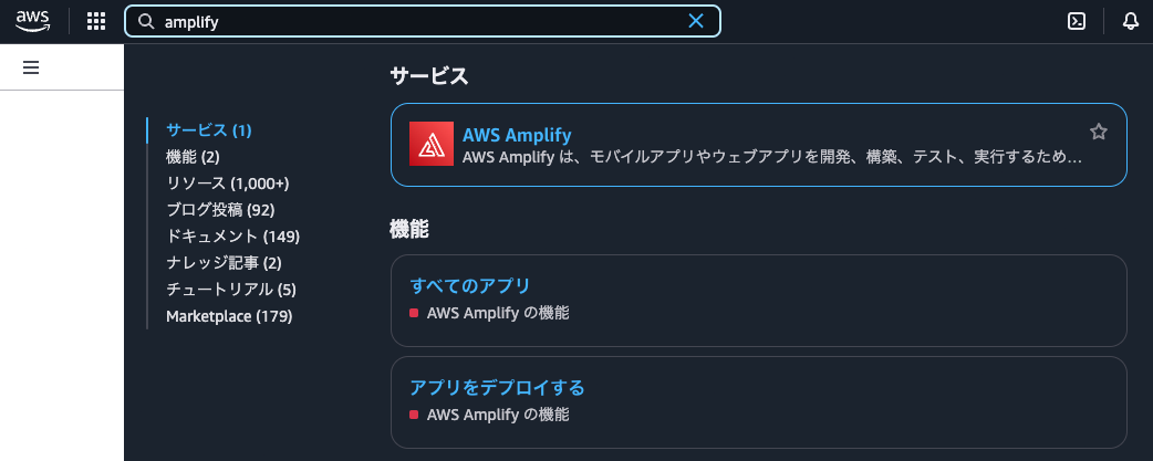 AWSにログインをしたら検索から「amplify」と入力しAmplifyの画面にアクセスします。