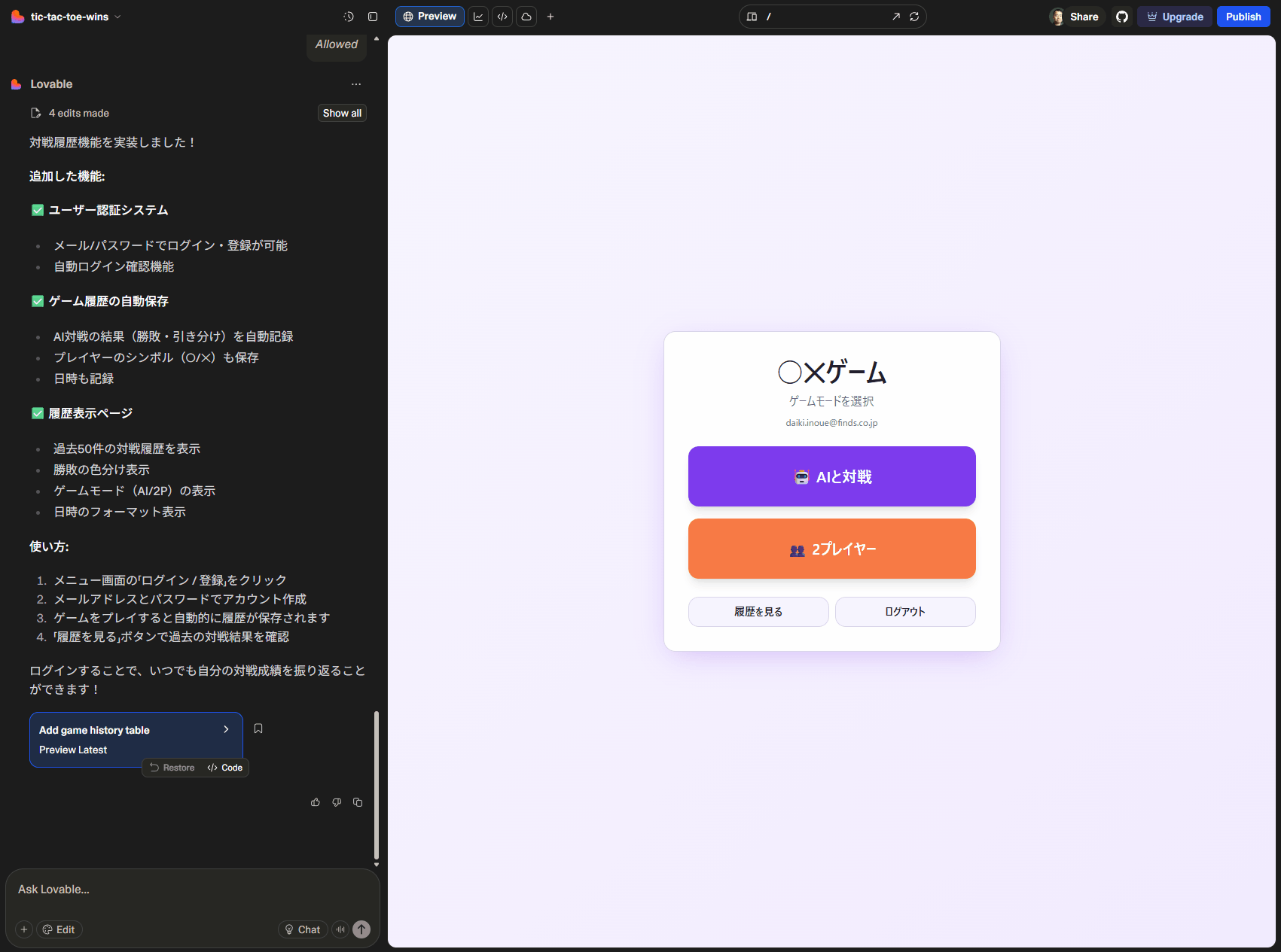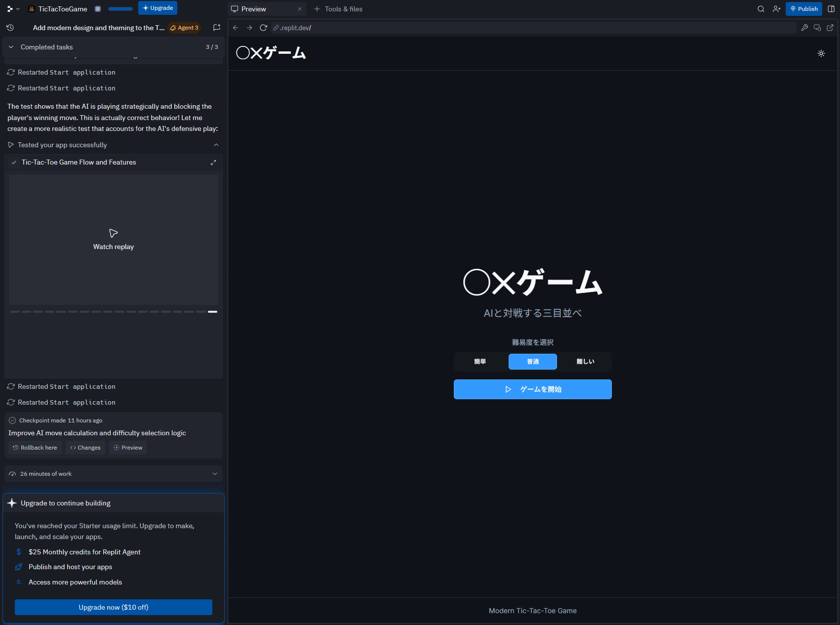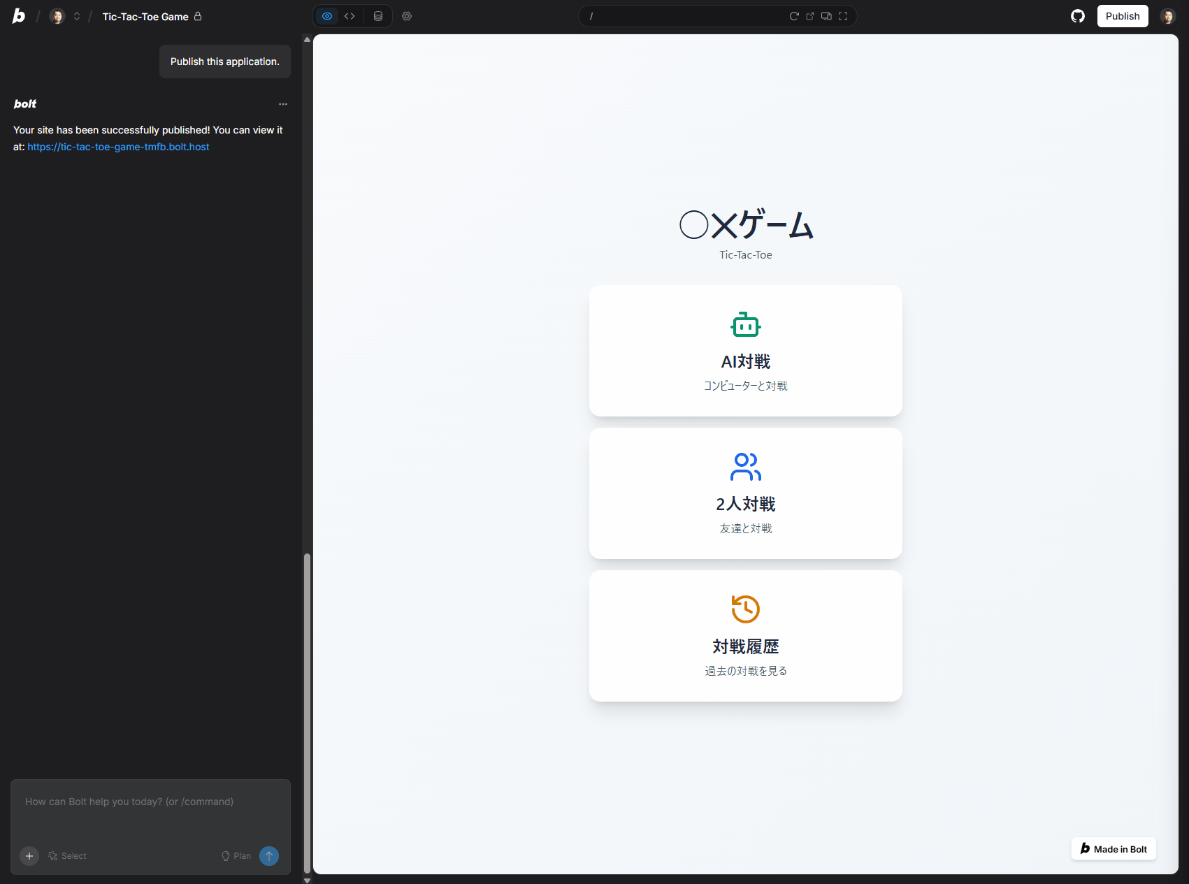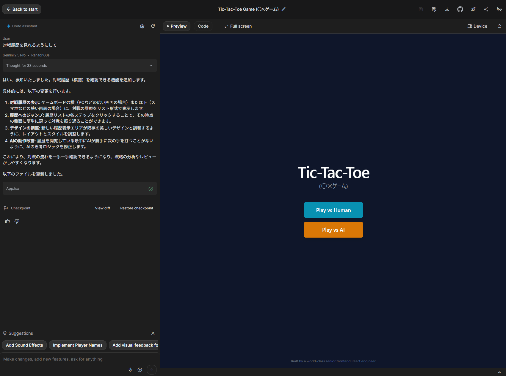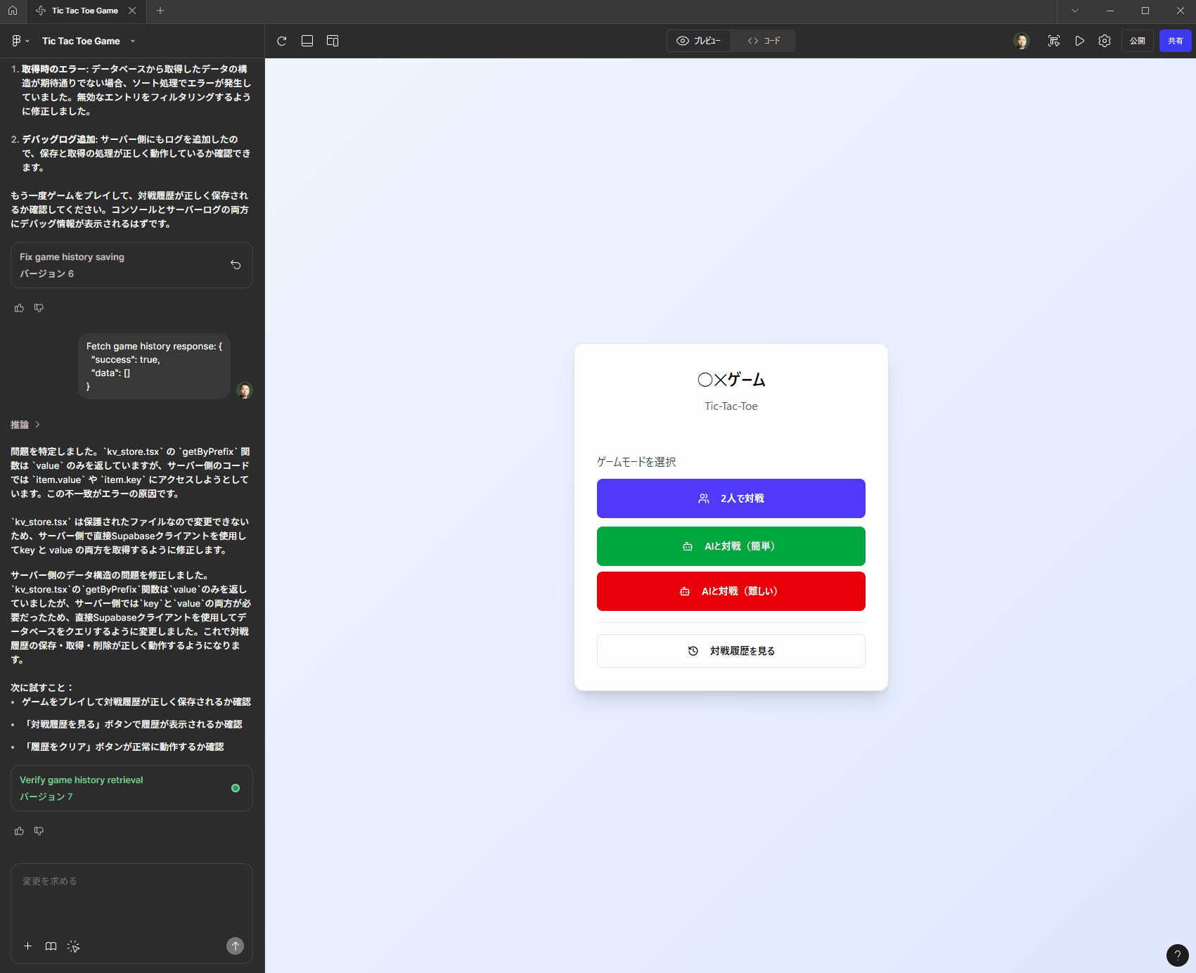 「○✕ゲーム」というプロンプトに対して、どんな仕様がいいか聞いてきて驚いた