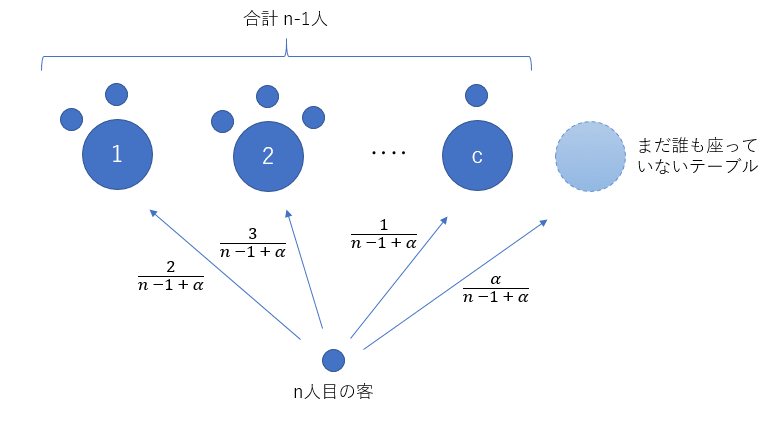 この離散データの生成方法は、中華料理店過程 (Chinese Restaurant Process = CRP) と全く同じ式です。