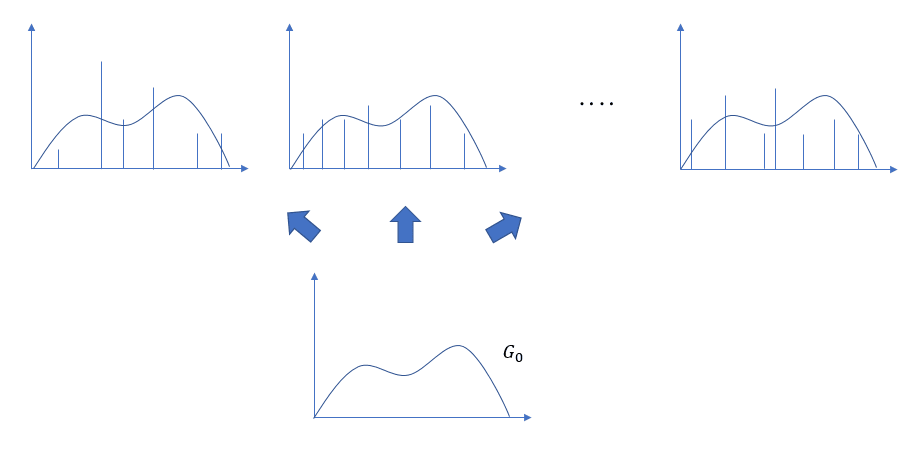 - ディリクレ過程というさいころを1回振ると、出た目に従ってある離散分布 G が生成されます