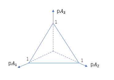 第1引数に対応する第1のパラメータは A_1 からデータが出る確率 pA_1、第2引数に対応する第2のパラメータは A_2 から出る確率 pA_2、第3引数に対応する第3のパラメータは A_3 から出る確率 pA_3 を表します。3次元の場合の分布はちょっと分かりにくいですが、正三角形は pA_1 + pA_2 + pA_3 = 1 を満たす平面を垂直方向から見ていると思ってください。色の濃淡が等高線を表していて、温度が高そうなところが確率が高いことを表しています。