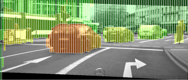 *Figure 7: Segmentation SGMと、Figure2の画像を使用して得られた出力。 近いオブジェクトは赤く、遠いオブジェクトは緑色で表現されている。道路は透明。*tac