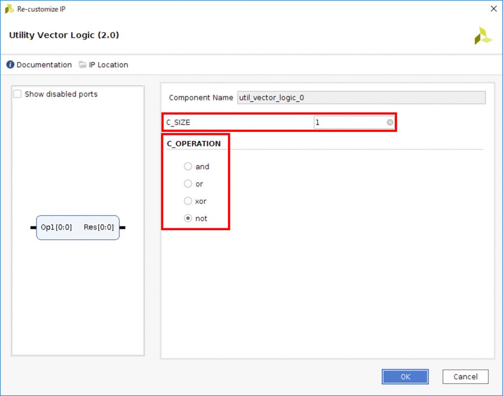 Clocking Wizard は active high な reset を必要とするので、active low な reset を反転させて作ります。Add IP... で Utility Vector Logic を追加し、Customize IP... で設定変更を行います。