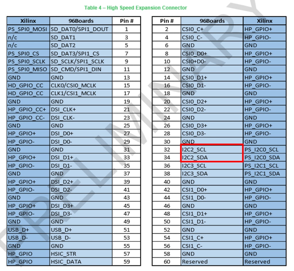 この先は Ultra96 ボードの HS コネクタに繋がります。 下の表を見ると、Ultra96 上では、I2C2_SCL, I2C2_SDA です。 Ultra96 上の HS コネクタの先はハードワイヤードされていて、HS コネクタの 32番、34番は Zynq の外部ピン経由で I2C バスに繋がります。 Zynq PS からは I2C2 を制御すればよいということになります。