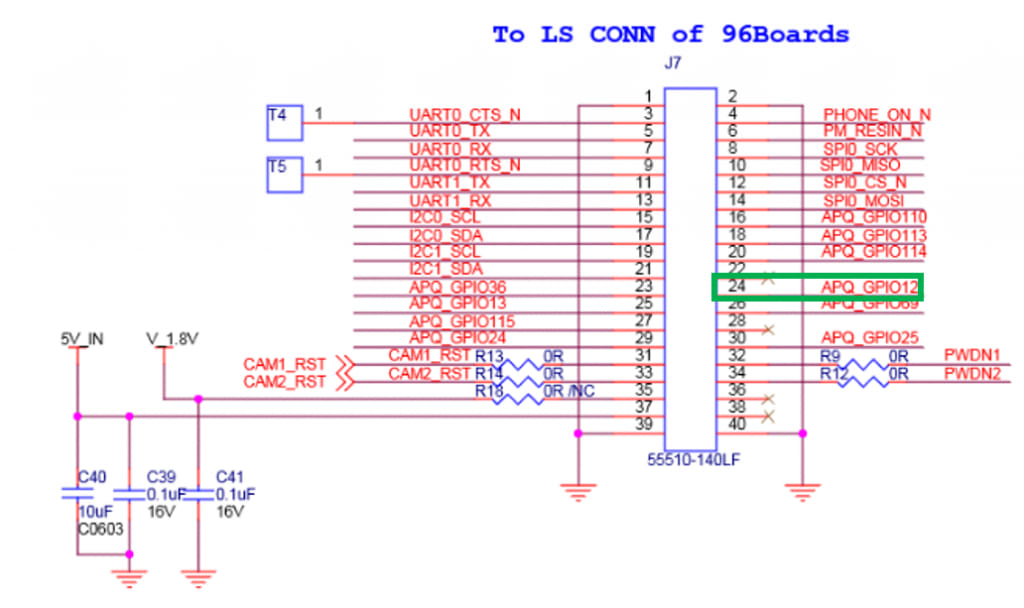 2番をどこかと繋げないといけませんが、ジャンパーピンで簡単にショートできる 1番を選びましょう。というわけで、次は 1番 APQ_GPIO12 を調べます。APQ_GPIO12 が MIPI ボード上のどこに繋がっているか調べてみると、LS コネクタの 24 番であることが分かります。