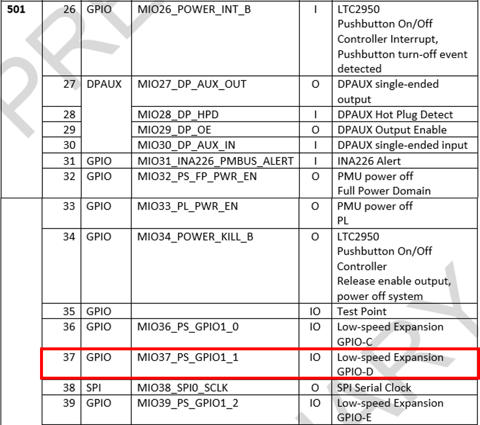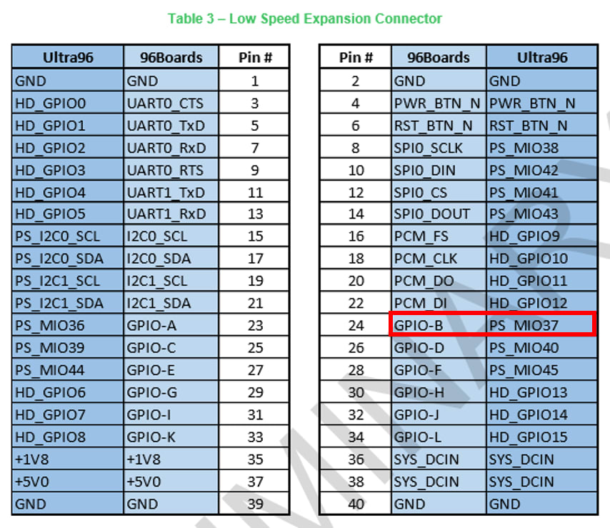 この先は Ultra96 ボードの LS コネクタに繋がります。 下の表を見ると、Ultra96 上では MIO37 となっています。Ultra96 上の LS コネクタの先はハードワイヤードされていて、LS コネクタの 24番は Zynq の外部ピン経由で MIO37 に繋がります。 Zynq PS からは MIO37 を制御すればよいということになります。