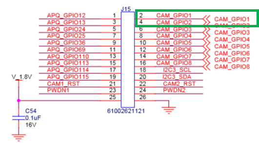 J5 コネクタの MIPI 以外の信号を見てみると、SCL, SDA の信号と GPIO の信号があります。SCL, SDA は I2C のクロック信号とデータ信号です。