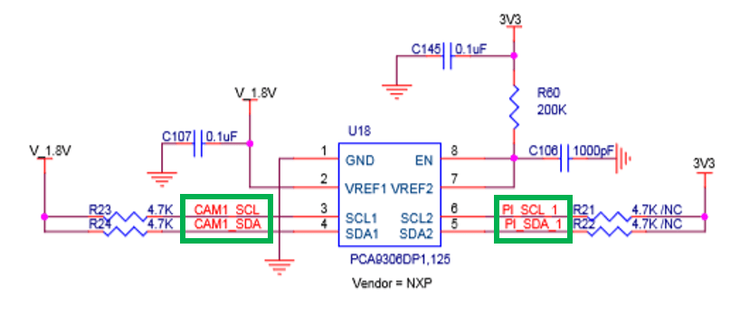 J5 コネクタの PI_SCL_1, PI_SDA_1 がどこに繋がっているか調べてみると、U18 PCA9306 を経由して J13 ピンヘッダの 20番、22番に繋がっていることが分かります。