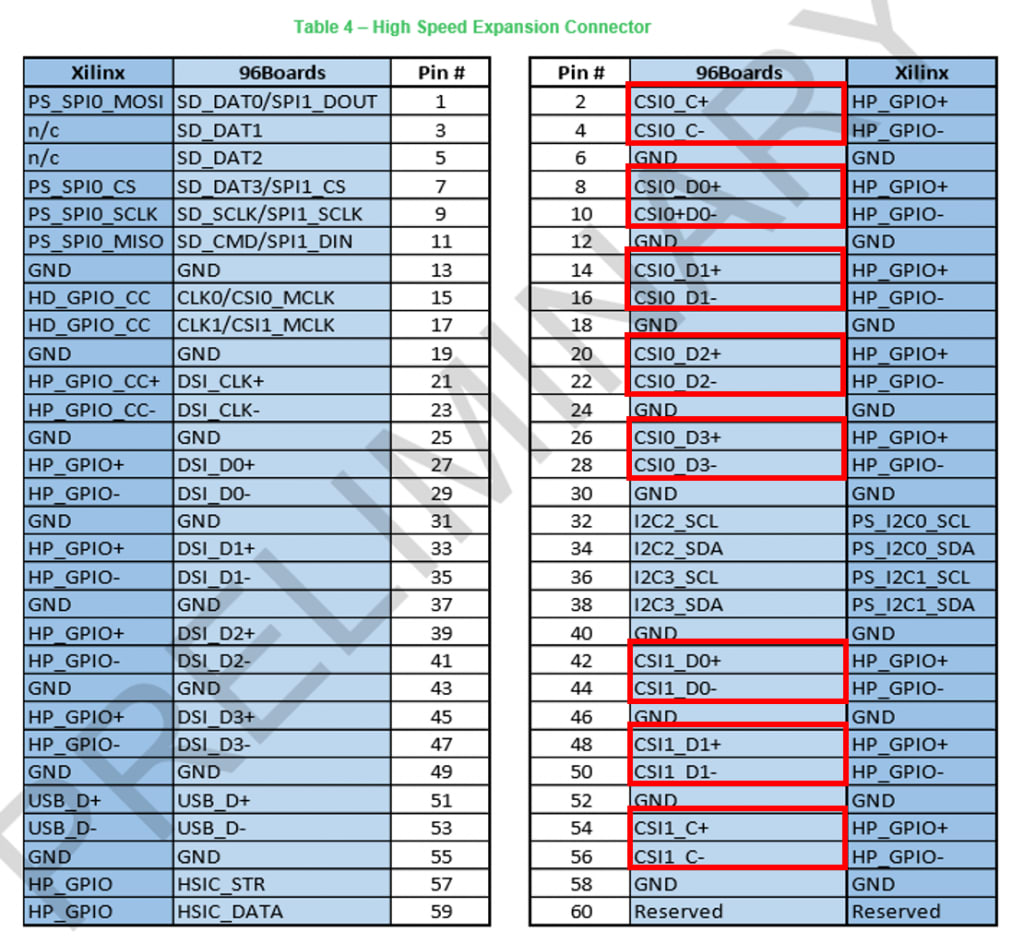 MIPI1_XX とか MIPI2_XX とかが MIPI の信号です。Ultra96 側の HS コネクタ(下の表)と照らし合わせてみると、MIPI1 系統が Ultra96 上の CSI0 系統に、MIPI2 系統が同 CSI1 系統に対応することが分かります。