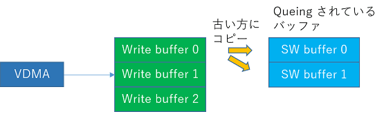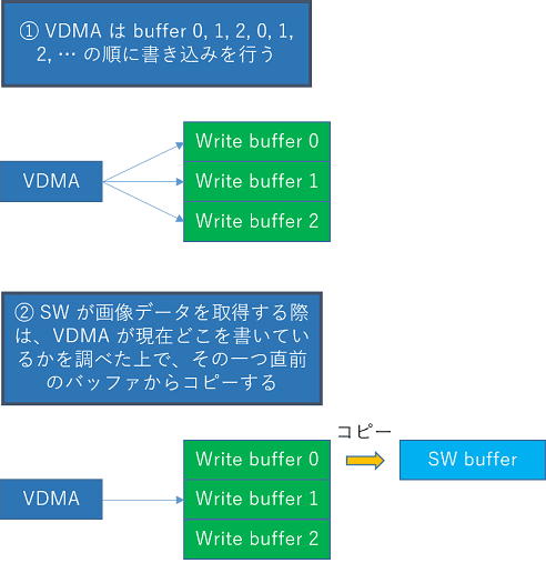 この初期化により、VDMA は 3つの write buffer を循環しながらひたすら書き続けるようになります。SW が画像を取得する際には、3つの write buffer から最新のバッファを選んで、そこから画像データをコピーするようにします。