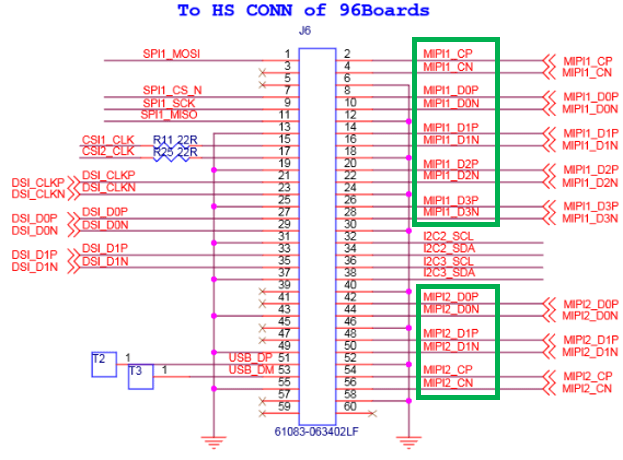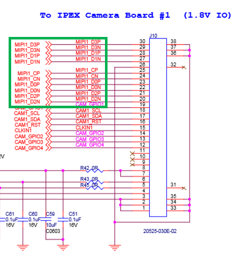 MIPI ボード上で、MIPI1 系統がどこに繋がっているか、回路図を調べてみると、J10 コネクタと J5 コネクタであることが分かります。