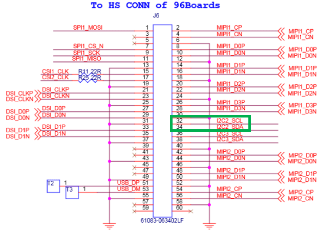 さて、続きです。I2C2_SCL, I2C2_SDA がどこに繋がっているか調べましょう。調べてみると、HS コネクタの 32 番、34 番に繋がっていることが分かります。