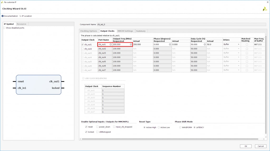 | Output Clocks タブ | clk_out1 の Output Freq (MHz) の Requested | 100.000 から 200.000 に変更 | 200MHz クロックを生成するため |