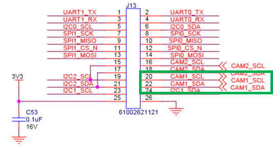 20 番 CAM1_SCL を IC2X_SCL に、22 番 CAM1_SDA を IC2X_SDA に繋げれば良さそうです。J13 ピンヘッダには I2C0 系統、I2C1 系統、I2C2 系統が、J15 ピンヘッダには I2C3 系統があります。どこに繋いでも大丈夫と思いますが、ジャンパーピンで簡単にショートできる I2C2 系統にしましょう。ジャンパーピンを使って、19番と20番、21番と22番をショートさせましょう。
