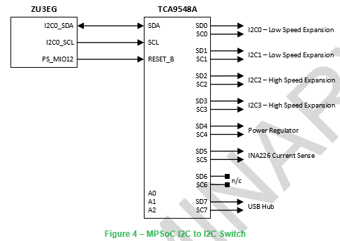 実は、Ultra96 には TCA9548A なる I2C スイッチが搭載されていて、一つの I2C コントローラから複数の I2C バスを制御できるようになっています。(↓の図では左の Zynq 側が I2C0_SDA, I2C0_SCL となっていますが、I2C1_SDA, I2C1_SCL の間違いではないかなあと思います。)