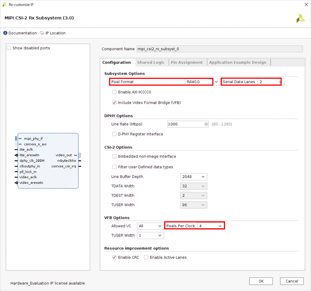 | Configuration タブの Subsystem Options | Serial Data Lanes | 1 から 2 に変更 | MIPI ボードの制約のため、2レーンまでしか使えない |