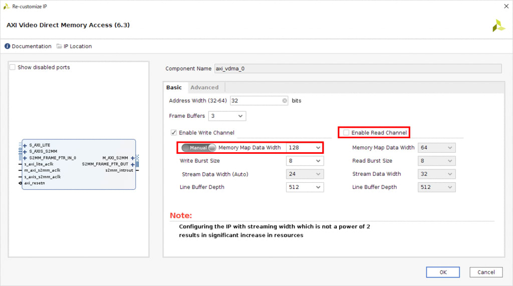 VDMA の M_AXI_S2MM のデータ幅を 128 に変更することにより、この問題を解消しています。