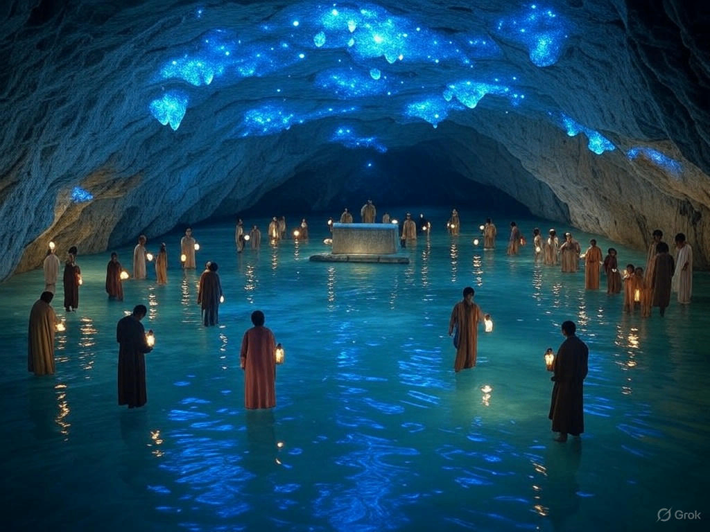 巨大な地下洞窟の中心部。天井からは青く輝く水晶が無数に垂れ下がり、自然の星空のように輝いています。洞窟の床には透明度の高い浅い湖があり、天井の光が水面に反射して幻想的な光の模様を描いています。