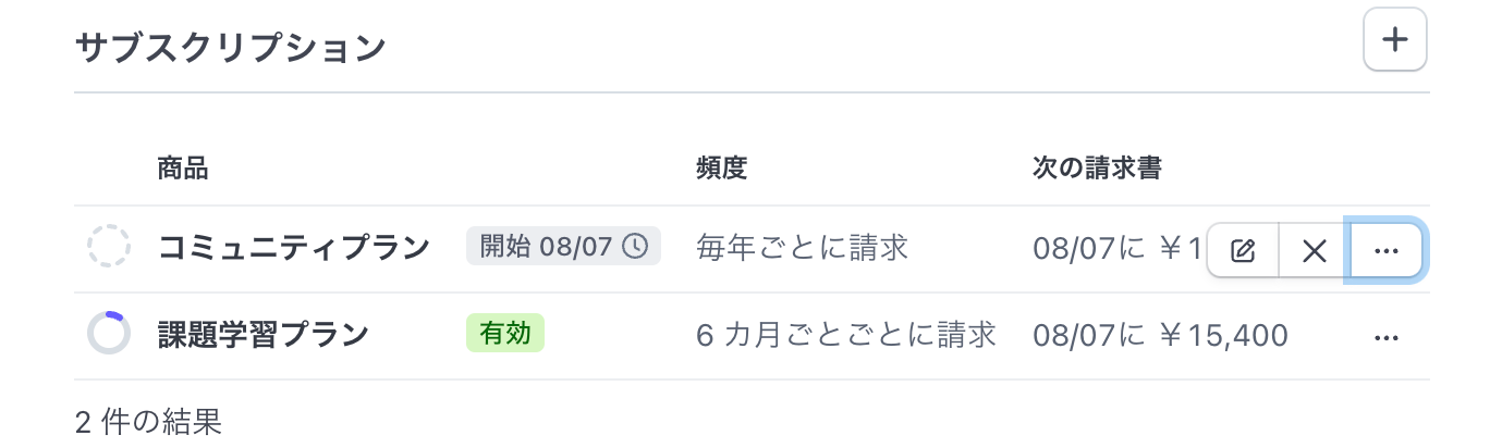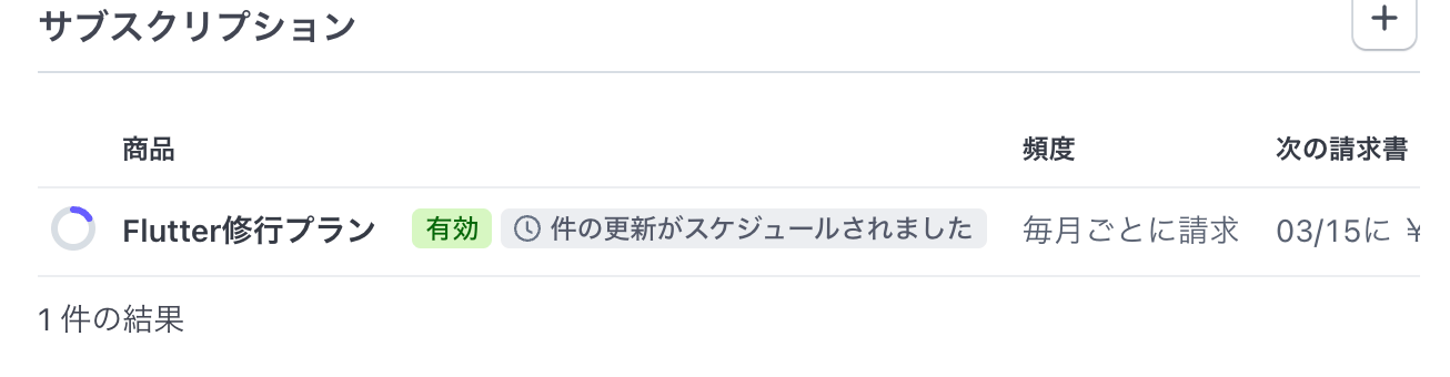 いきなりcreateのAPIだけで全ての必要パラメータを渡して行けるといいのですが、from_subscriptionというパラメータを使わなかった場合、新しいSubscriptionを作ってしまい、下図のようにサブスクが2つになってしまいます。(今回は基本的に変更予約に使うので既にSubscriptionがある)