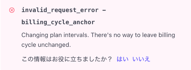 しかし、invalid_request_error - billing cycle anchor というエラーが特定の条件で起こるようになり、利用者の何人かにご迷惑をお掛けしてしましました。