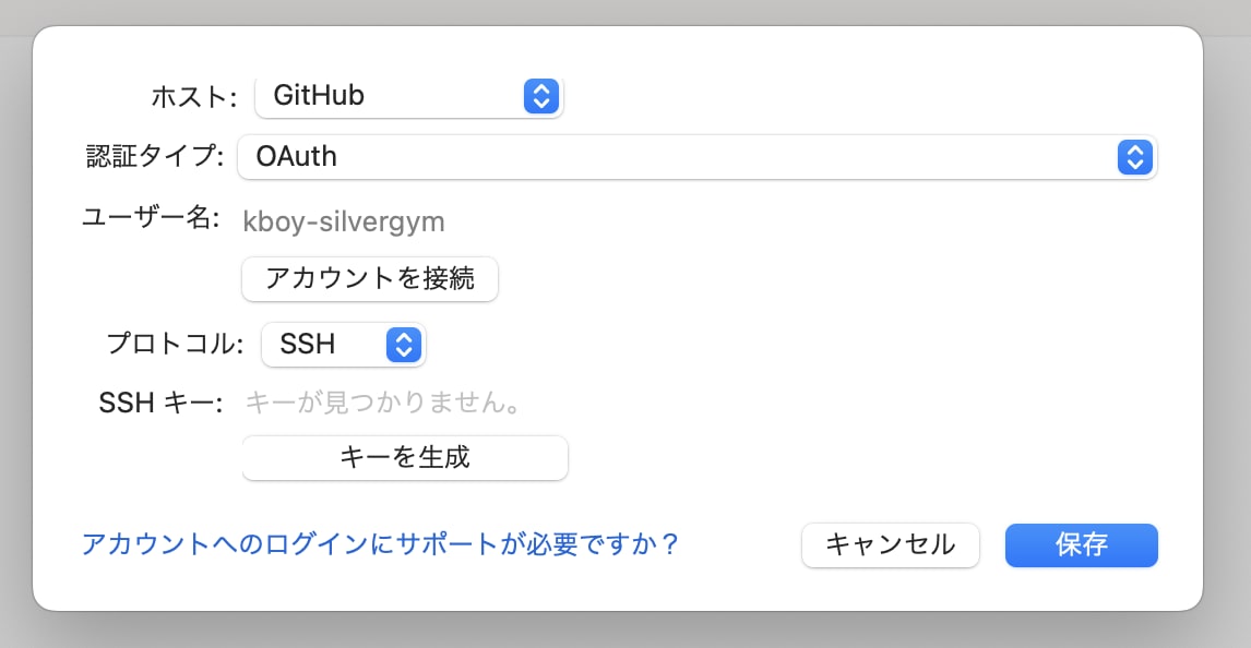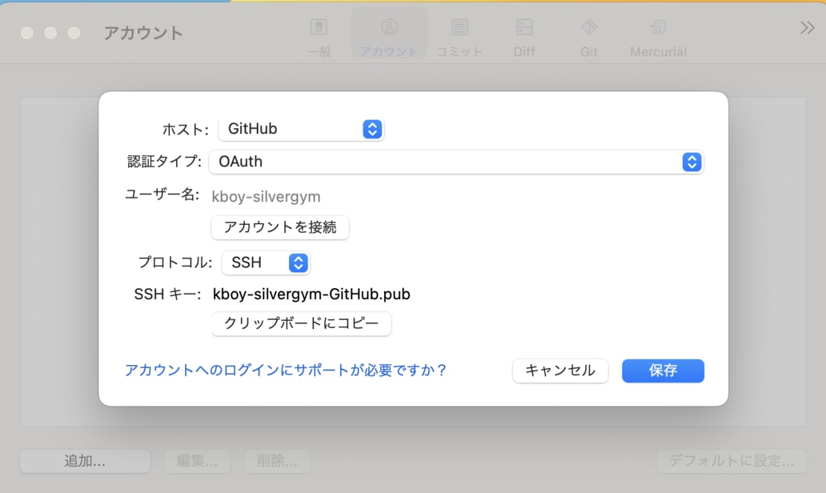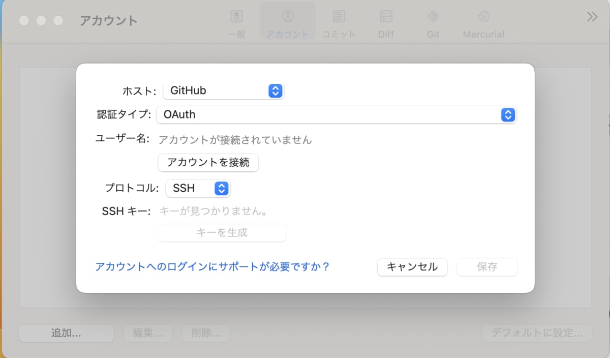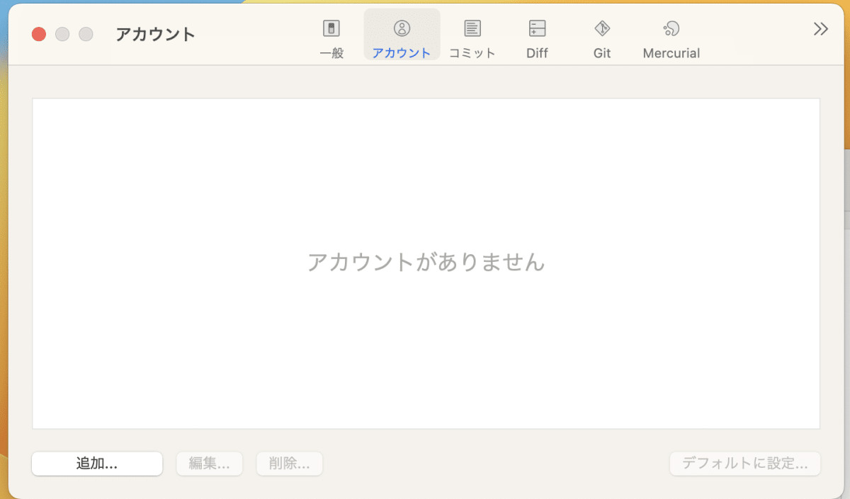 GitHubアカウントをSourceTreeに登録しておくと、権限まわりで苦労することがなくなるので便利です。