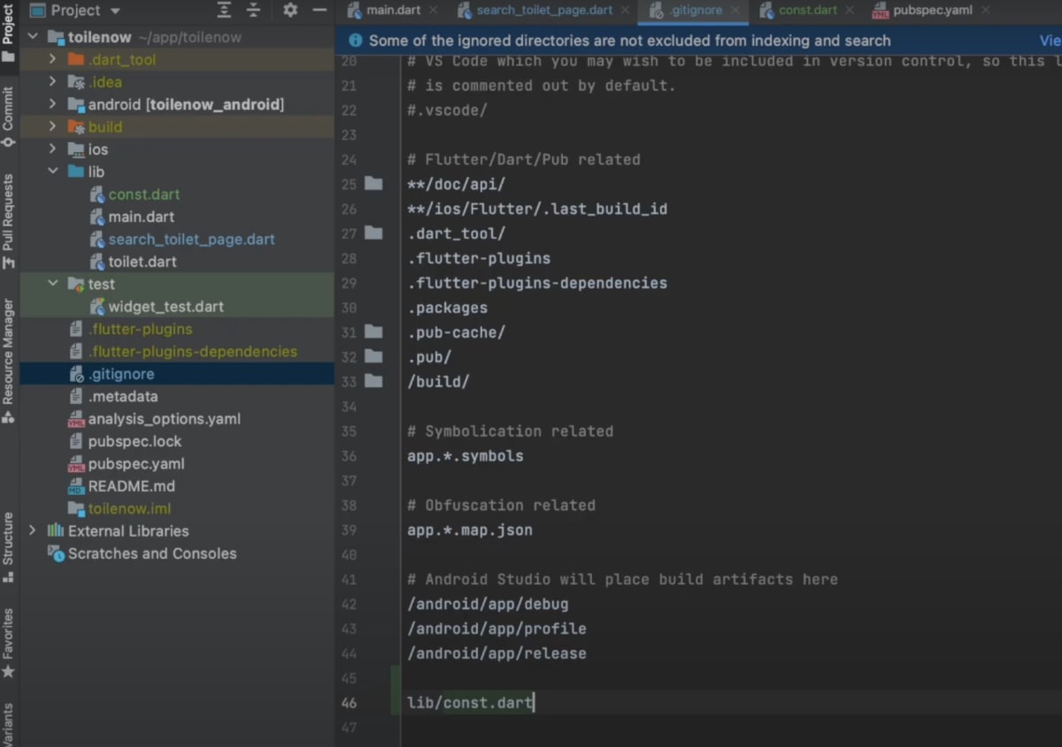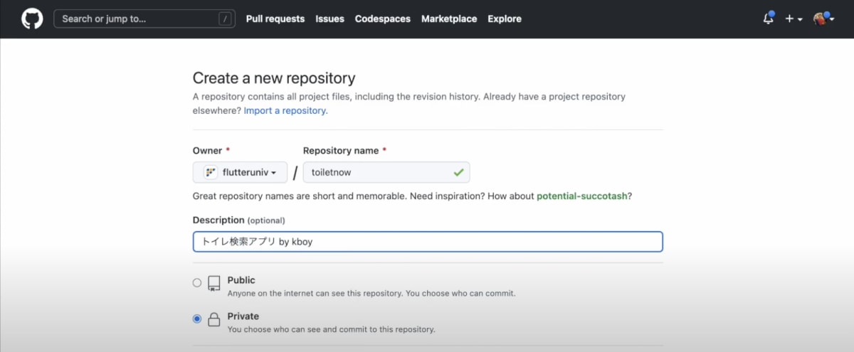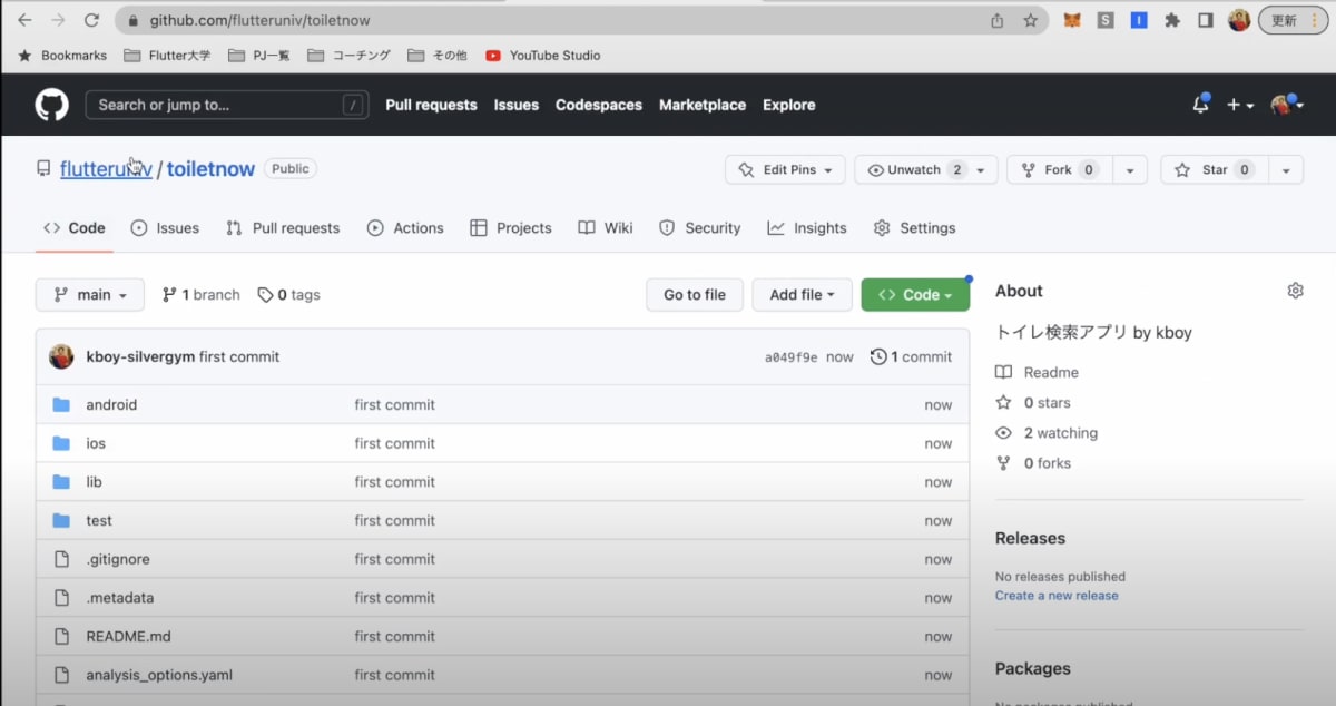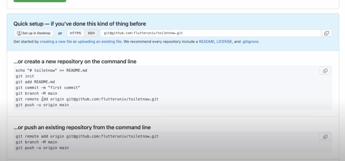 git remote add origin git@github.com:flutteruniv/toilenow.git // ここのリポジトリ名は人によって違います