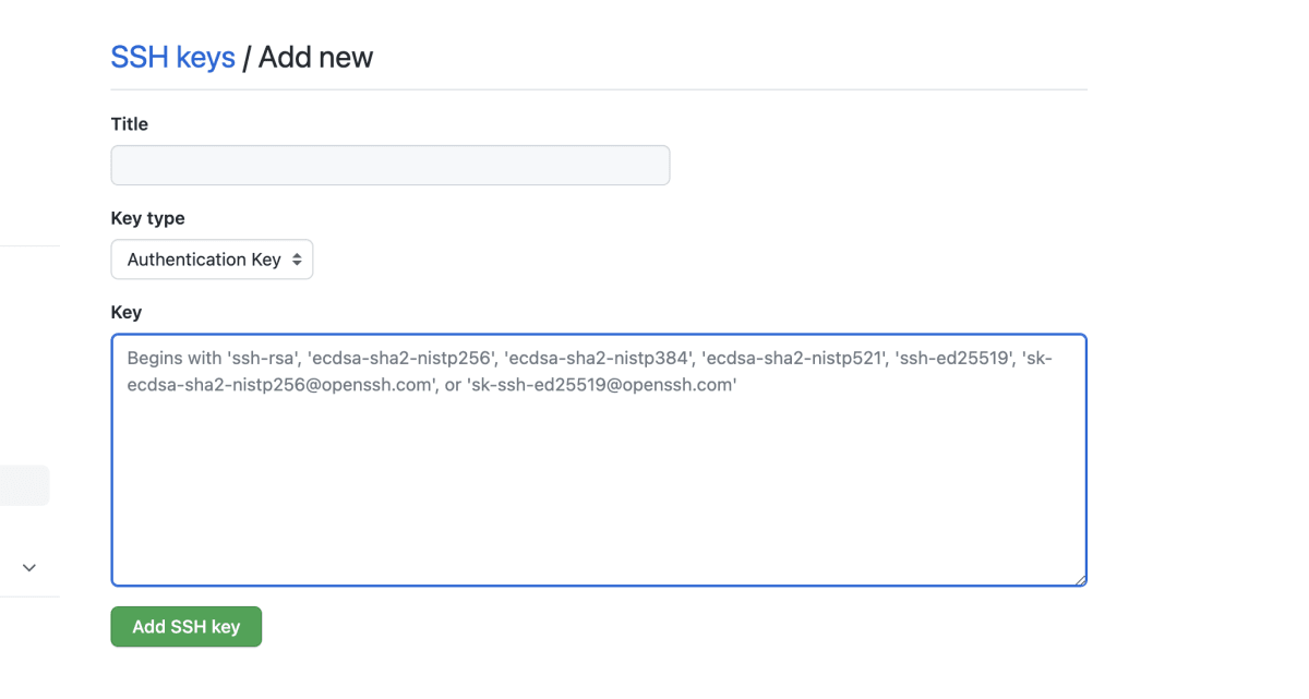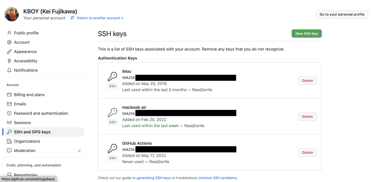 「SSH and GPG keys」を選択。右上の「New SSH Keys」を押して追加します。