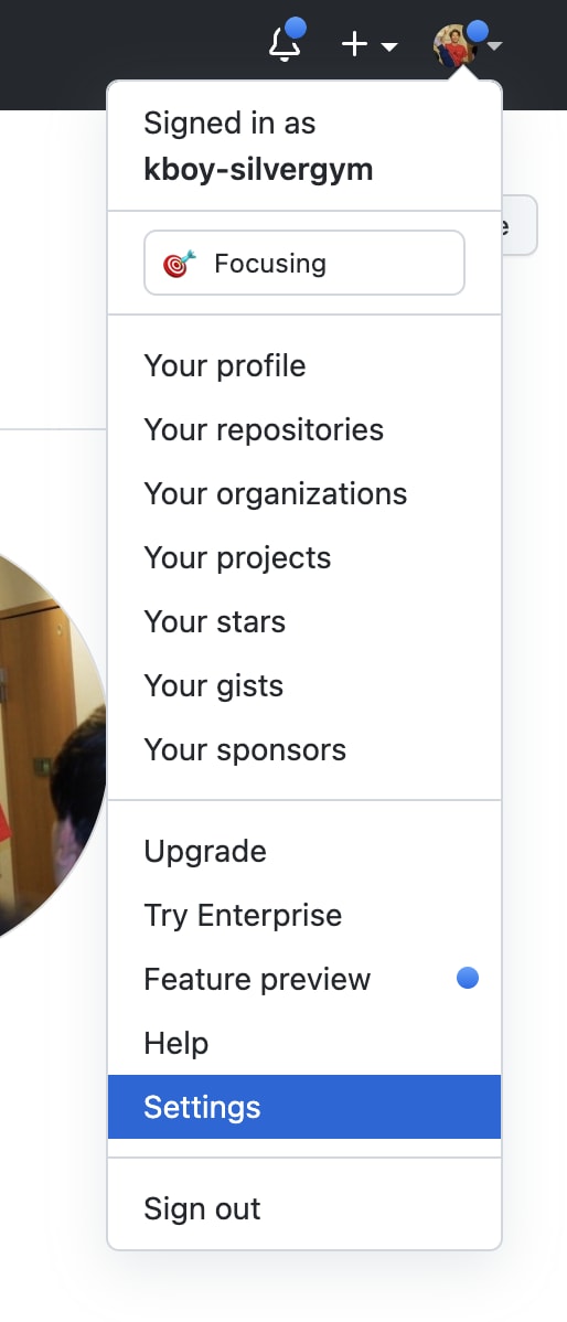次に、GitHubを開き、右上のアイコンからSettingを開きます。