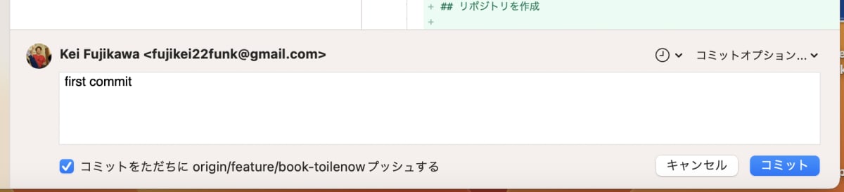 最後に、コミットメーセージを入力し、「コミットをただちにプッシュする」にチェックを入れてコミットボタンを押すと、GitHubにアップロードされます。