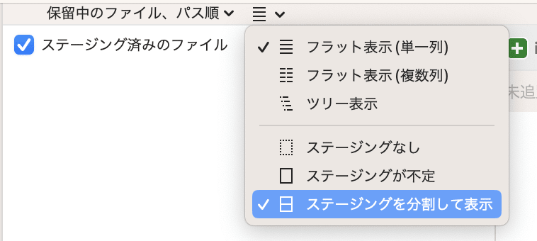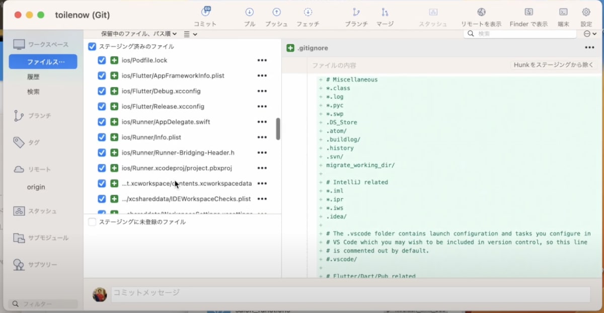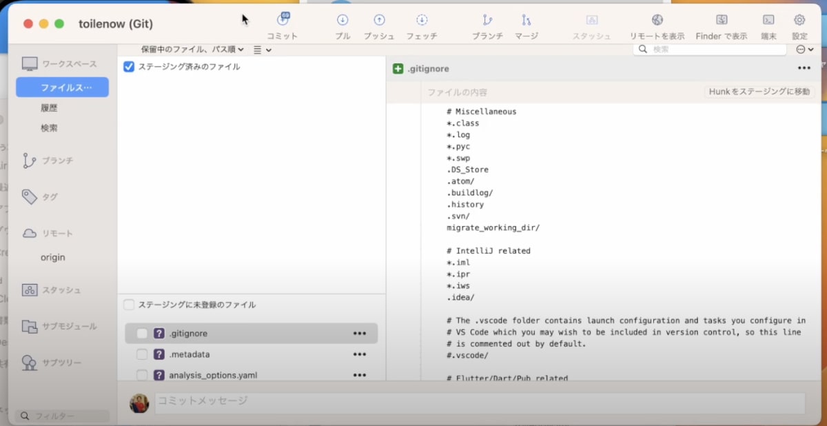 下のステージにある「ステージングに未登録のファイル」すべてにチェックを入れると、上のステージに移動します。これがコミット対象です。