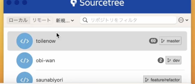 SourceTreeを開くとリポジトリ一覧画面が現れます。(画像ではいっぱいありますが、最初は空だと思います。)